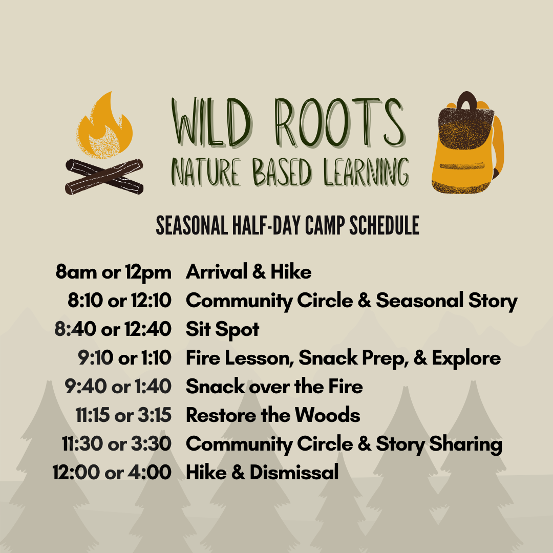 NOTE: Lunch will not be provided during Half-Day Camps, and children do not need to bring a lunch. Snack (cooked over the fire!) will be provided.